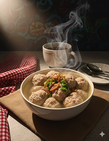 Lighting/Mood: Dramatic, moody, high-contrast urban lighting. Use an intense single spotlight, warm tungsten, coming from the upper left to create strong, defined shadows on the bowl's edge and foreground. The light must intensely enhance the glistening quality of the clear, hot broth and the wet surface of the bakso. Add prominent, visible, swirling steam rising intensely from the bowl for a captivating visual effect. A cup of coffee with steam rising is visible in the blurred background.