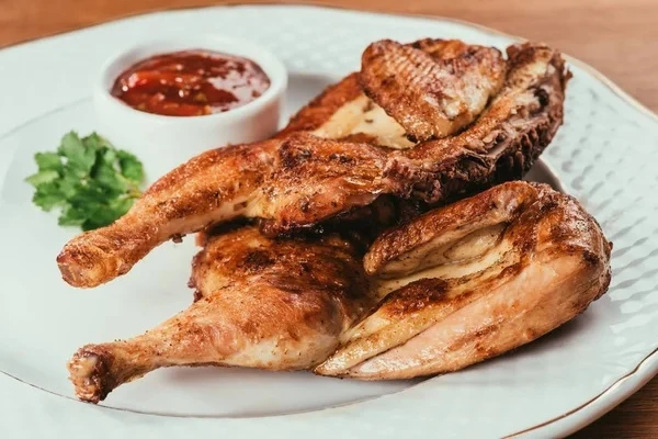 Add small sparks of fire and glowing smoke trails around the chicken to emphasize the hot, freshly grilled feel. The lighting is warm and moody, with golden highlights and soft shadows to enhance the texture and juiciness of the chicken.