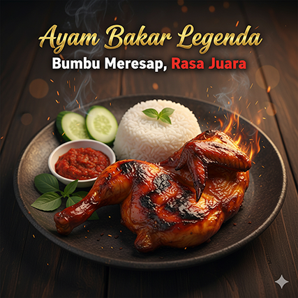 A professional cinematic food photography of grilled chicken (ayam bakar) served on a rustic dark plate with a side of steamed rice, sambal, cucumber, and fresh basil leaves. The chicken skin is perfectly caramelized with glossy dark-red glaze, slightly charred edges, and glowing reflections from the sauce.
