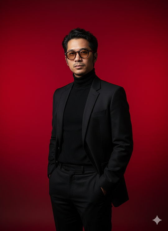 A cinematic editorial portrait captures a confident man dressed entirely in black-a black turtleneck paired with a black tailored suit. He stands with both hands in his pockets, his gaze intense, set against a striking red gradient background. The lighting is smooth and directional, casting soft shadows on his face and suit to highlight his facial structure and the clean lines of his attire. The studio environment is distraction-free, exuding a fashion-forward vibe. This image was created using an 85mm portrait lens with a high-contrast lighting setup, embodying a style reminiscent of fashion magazines. The minimal color palette, cinematic red backdrop, matte finish texture, and DSLR depth rendering contribute to the sophisticated studio fashion photography.