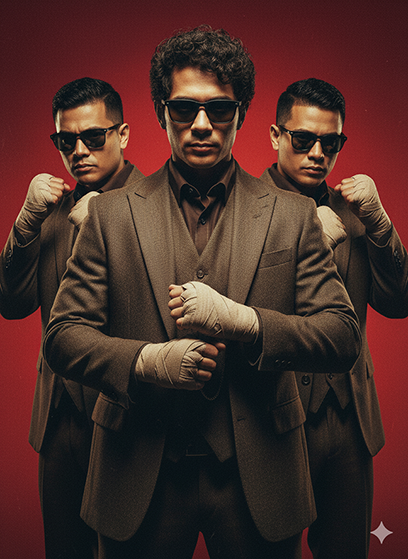 A cinematic duo standing together boldly gives off cold vibes and expression. Wearing black sunglasses, Style the person as a strong, focused boxer Wearing a Brown Herringbone 3-Piece Suit one person is adjusting fists wrapped in tapther one is fists wrapped in tape.