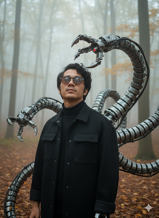A cinematic sci-fi shot of a young man with mechanical tentacle-like robotic arms emerging from his back, set in an outdoor daytime scene with a misty autumn forest background.