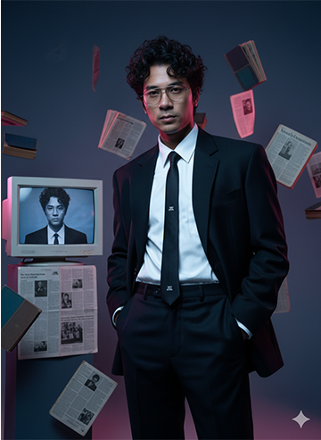 detail, and modern eyeglasses. Hairstyle: styled upwards with a