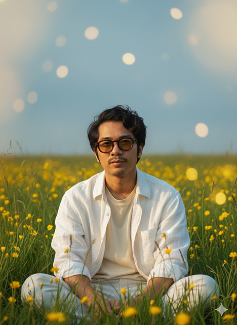 Transform the uploaded image into a serene cinematic portrait of the same person sitting amidst a lush field of tall grass with vibrant yellow flowers. Keep the original face, hair, and beard completely unchanged and natural. Replace the background with a softly blurred bluish gradient that blends into the grassy field, enhanced with subtle bokeh effects for a dreamy golden hour atmosphere. The subject should be wearing a loose white button-down shirt layered casually over a cream inner top, with natural fabric texture visible. The lighting should be warm and diffused, creating gentle shadows and a soft daylight glow across the subject's expression and clothing. Emphasize the fine details in the grass, fabric, and skin tone while maintaining cinematic depth and smooth optical blur in the background.