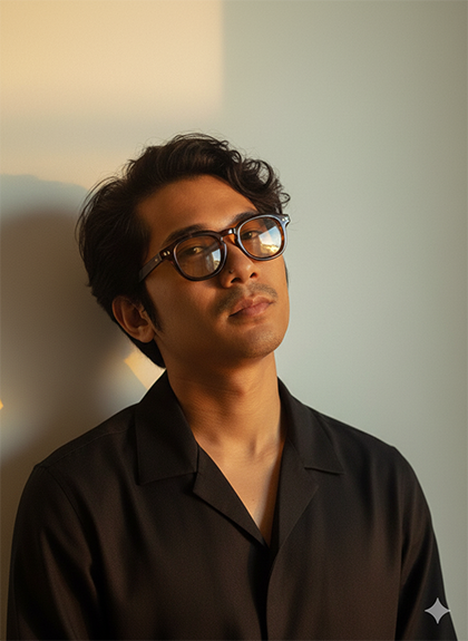 confident expression. He has softly tousled hair and sharp jawline. He