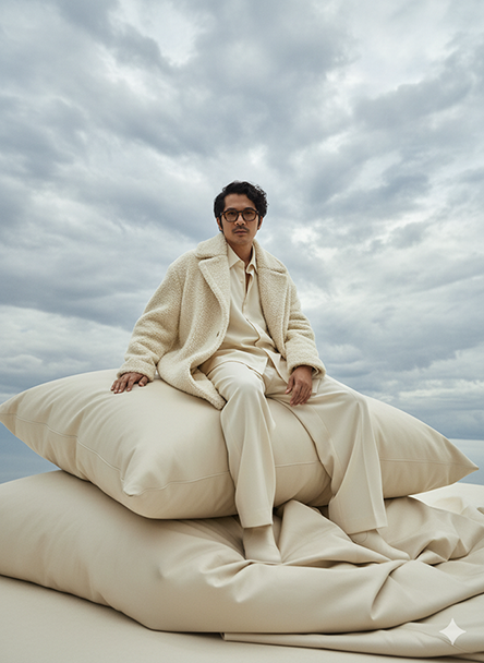 2.5 FlashMedium shot of the man pictured, seated atop a giant sculpture of matte ivory leather sheeting with loops, gazing directly at the camera. He wears an oversized ivory wool coat, an oversized ivory shirt, ivory trousers, and matching shoes. The background is a cinematic, cloudy sky, creating a surreal yet luxurious vibe with art direction inspired by Loewe.
