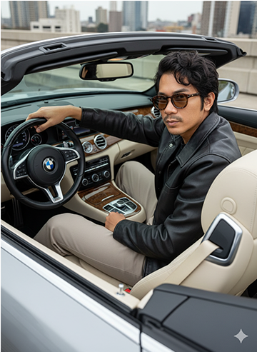 driver’s seat. Pose: leaning back confidently, one hand on the
