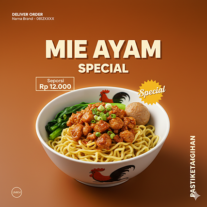 A professional food advertisement poster of a bowl of Mie Ayam Special (Indonesian chicken noodle with meatballs), presented in a classic white bowl with a rooster illustration. The dish features yellow noodles topped with seasoned diced chicken, chopped scallions, and fresh green vegetables. The lighting should emphasize the glossiness of the noodles and the tenderness of the chicken, giving a warm, appetizing look.