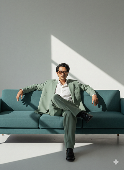 casually on a modern teal sofa in a minimalist studio. He is