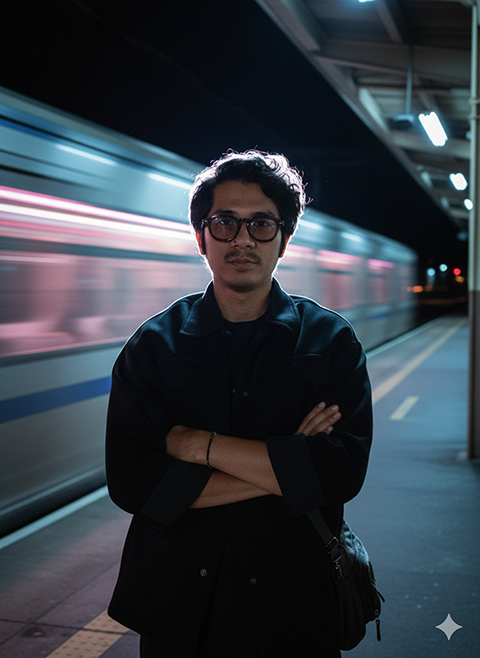 Under the stark, white glare of a camera flash, a man with an average build and naturally styled hair stands solitary on a quiet train platform at night. He grips a small bag loosely at his side, his jacket capturing the intense light to sculpt dramatic highlights and deep shadows across his form. Behind him, blurred neon streaks of electric blue and vivid pink from a passing train cast a soft ambient glow, infusing the subdued architecture with muted tones and softened edges. The tightly cropped composition balances the cool bursts of neon against warmer light contrasts, evoking a fleeting, candid moment reminiscent of early 2000s urban travel.