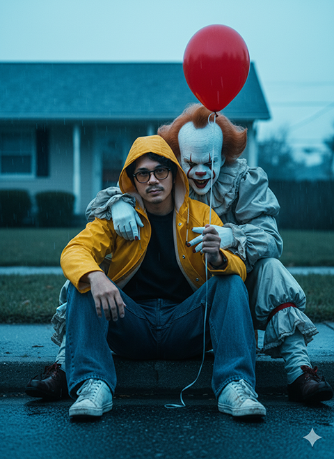 Based on the provided image, create an ultra-realistic close-up of a man with black hair and fair skin (preserving his real facial features and physical appearance without altering his face). He is sitting on the sidewalk wearing a yellow raincoat, with the hood covering his head but leaving his face visible. He wears wide-leg dark blue jeans and slightly dirty white sneakers. In his right hand, he holds a red balloon, while his left arm wraps affectionately around the clown Pennywise sitting beside him. In the background, a faintly blurred American house with a front yard is visible. The atmosphere is damp with light rain, and the asphalt ground is wet, illuminated by cool blue tones that give the scene a sense of gloom and melancholy. The lighting is natural and soft, with realistic reflections in puddles and a subtle shine on the balloon. The comosition conveys a cinematic sense of tension and mystery, resembling a movie scene. The aspect ratio is vertical 4:5, rendered in ultra-