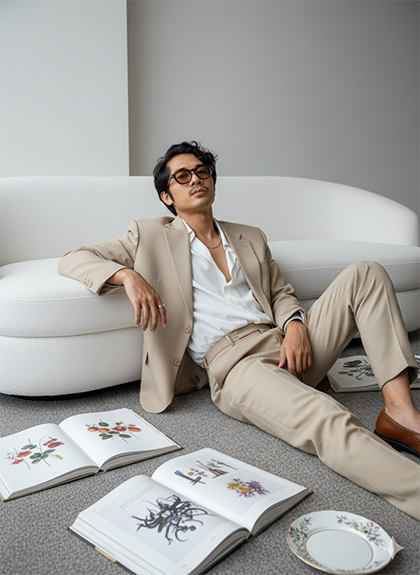 nearby, enhancing a refined lifestyle aesthetic. Background: