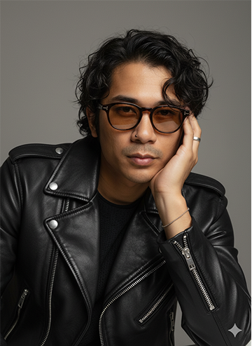 photo) in a moody editorial style. He rests his face on his hand with a