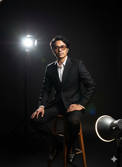 Ultra-realistic portrait of a man sitting on a wooden stool