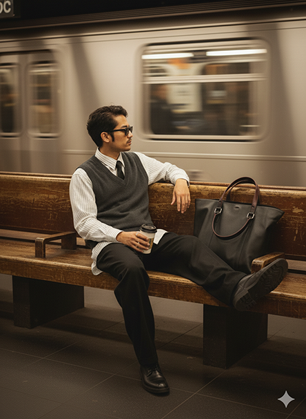 samping, tangan memegang cup kopi takeaway. Ia duduk