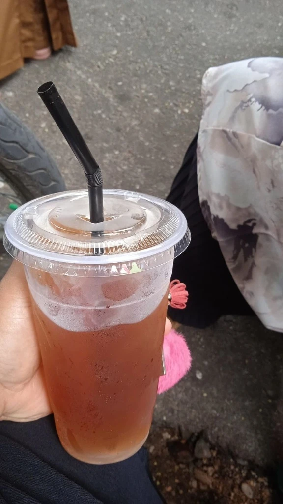 At the center bottom, a large transparent plastic cup filled with sparkling amber-colored iced tea and abundant ice cubes becomes the main visual focus. The cup surface is covered with realistic cold condensation, emphasizing the chill sensation.