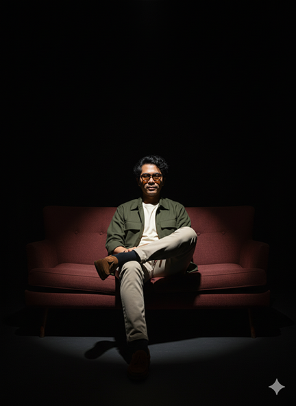 Setting: The setting is entirely black and minimalist, emphasizing the subject. The sofa is the only visible prop, centered within the frame. There are no distracting elements in the background, ensuring all focus is on the man and his illuminated sp