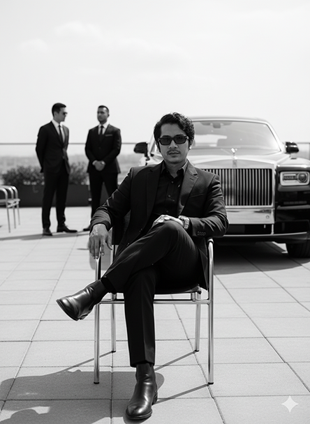A monochrome cinematic daylight portrait of a man seated on a minimalist metal chair in an open rooftop lounge. He wears a black suit, sleek shirt, Chelsea boots, silver watch, and narrow -rectangular sunglasses His posture is relaxed yet commanding one leg crossed, one hand on his knee, the other resting on the chair arm. Behind him, a blurred Rolls-Royce and two suited men add depth and prestige. Captured using an 85mm prime lens with soft background compression and dramatic tonal contrast, giving a luxury underworld vibe elegant, confident, and untouchable.