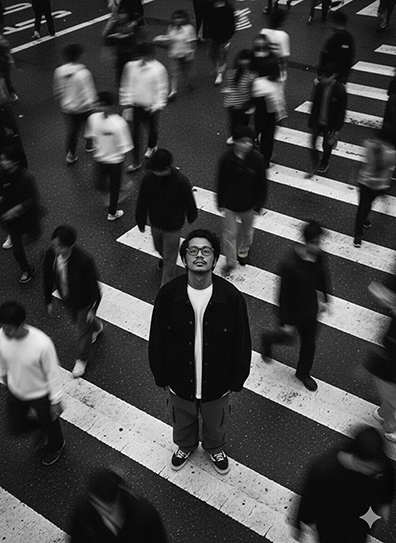 2.5 FlashCinematic street portrait of me ([uploaded photo], face 100% unchanged) on a crosswalk, wearing white shirt, black oversized jacket, olive cargo pants, black-and-white sneakers. Overhead shot, motion-blurred crowd rushing around, moody city lighting, 35mm film look, shallow depth, sharp focus on subject, artistic, timeless streetwear style.